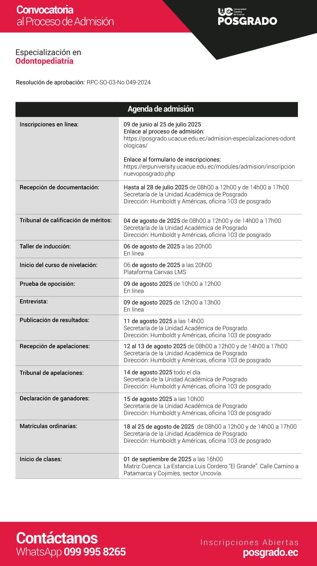 * Estatuto de la Universidad Católica de Cuenca * Guía Normativa del Proceso de Admisión * Instructivo de admisión de la Unidad Académica de Posgrado * Instructivo de becas, política de cuotas y ayudas económicas * Instructivo de nivelación de la Unidad Académica de Posgrado * Instructivo para rendición de exámenes en la plataforma * Reglamento de ingreso, nivelación y admisión * Instrumentos de Evaluación Proceso de Admisión – Rúbricas * Flujograma del Proceso de Admisión * Política de privacidad y protección de datos personales de la UCACUE