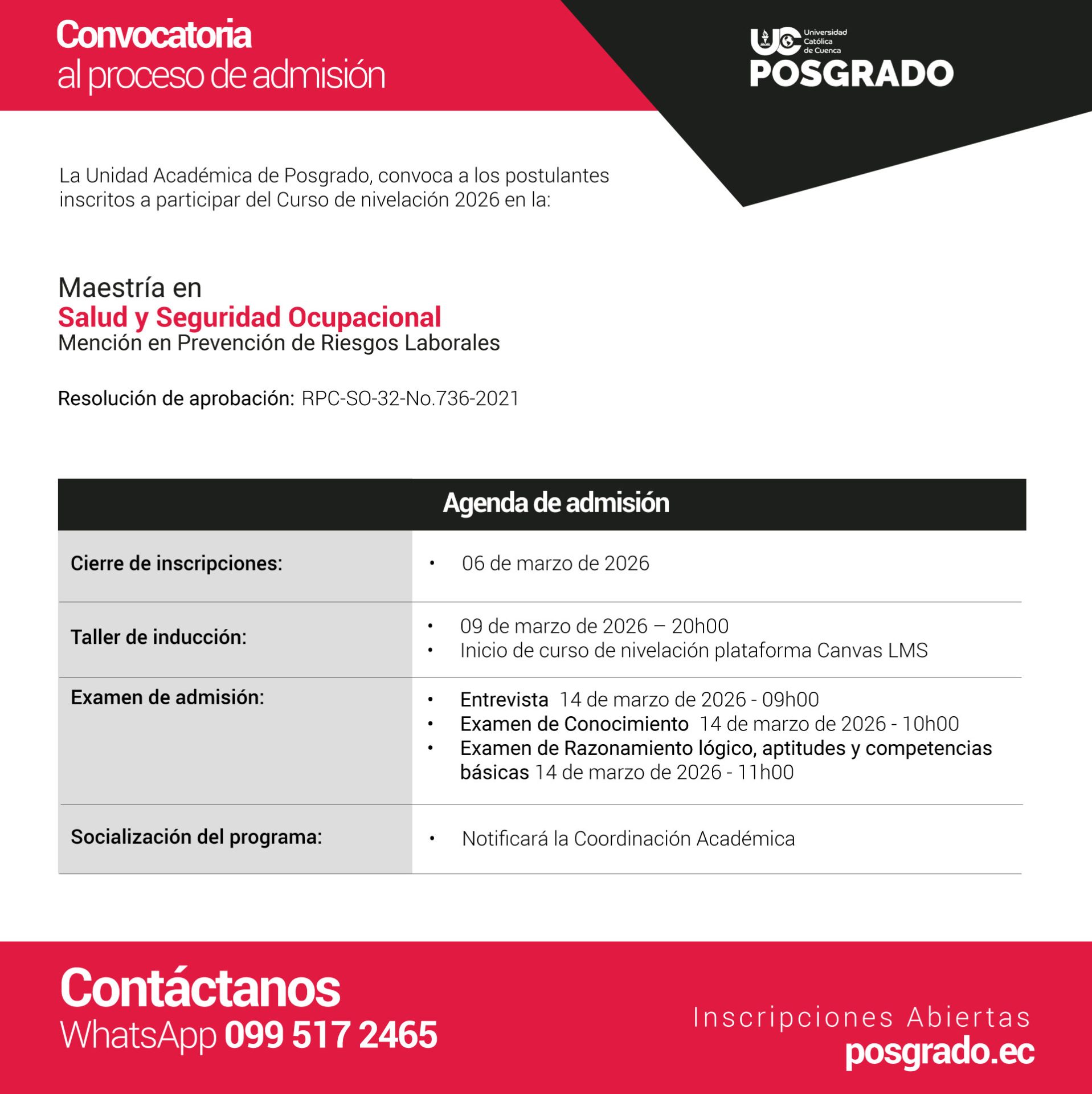 | Perfil de ingreso: | El programa permite el ingreso de profesionales con título de tercer nivel de grado preferentemente de Médicos, Psicólogos, Abogados, Ingenieros en Seguridad Industrial, Licenciados en Gestión de Riesgo, Ingenieros Industriales, Ingenieros Ambientales, Ingenieros Agrónomos, Ingenieros Químicos, Ingenieros en Alimentos, Ingenieros Civiles, Ingenieros Navales, Ingenieros Mecánicos, Ingenieros Eléctricos, Ingenieros Electrónicos, Ingenieros Comerciales, Ingenieros en Petróleos, Ingenieros en Minas, Economistas, sin embargo, podrán optar profesiones de otros campos, que acrediten al menos un año de experiencia laboral en el área. Nota: Este posgrado no aplica para profesionales con títulos de tecnólogos. |